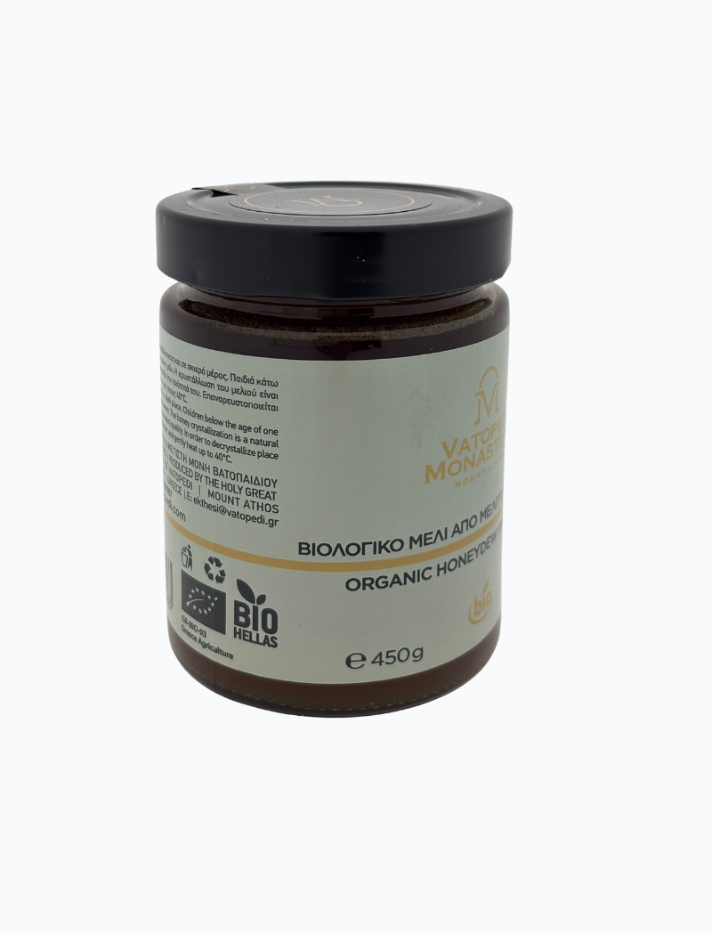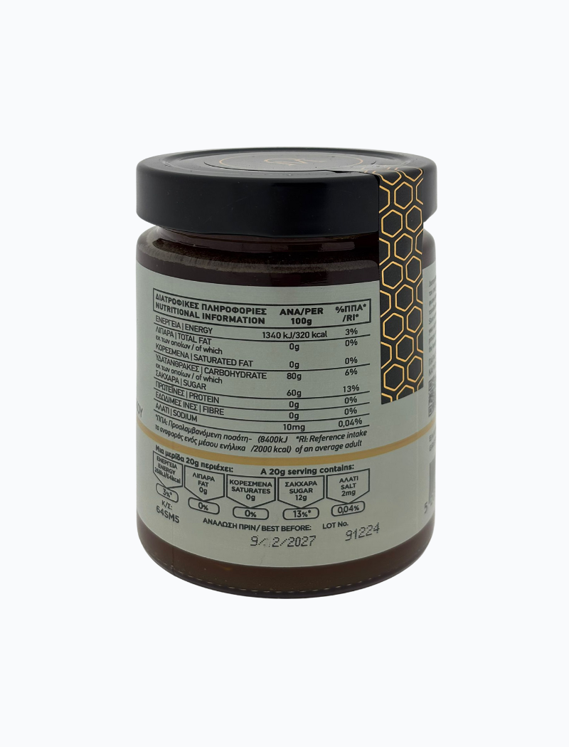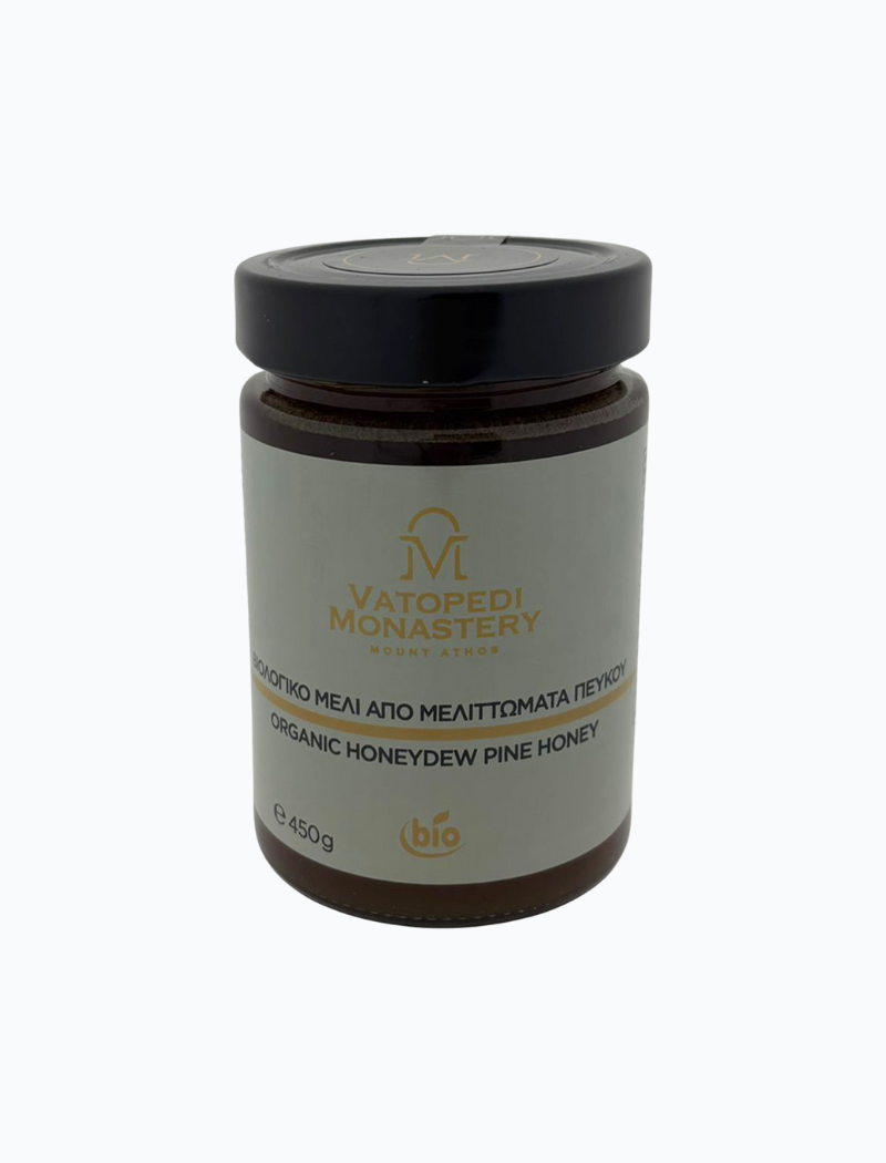 Pijnboomhoning is een bijzondere honingsoort die zich onderscheidt door zijn diepe, amberkleurige tint en rijke, kruidige smaak. Minder zoet dan bloemenhoning, met warme harsachtige tonen en een zachte, volle afdronk. Een honing met karakter, rechtstreeks uit ongerepte natuur. Afkomstig van het Griekse Vatopedi klooster op Mount-Athos.(UNESCO)